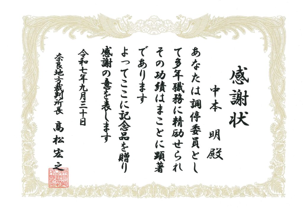 弊社会長 中本 明(民事調停委員)が奈良地方裁判所より感謝状を賜りました。